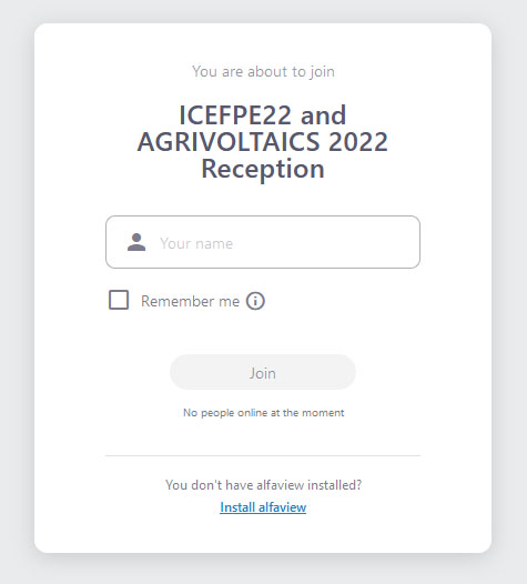 The Virtual (On-line) environment of the 12th International Conference & Exhibition on Green Flexible Printed Electronics Industry (ICEFPE22) and AGRIVOLTAICS 2022 will be conducted using the alfaview video conferencing system.